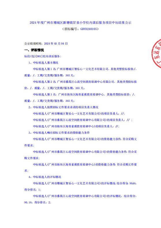 2024年度廣州市增城區(qū)新塘鎮(zhèn)甘泉小學(xué)校內(nèi)課后服務(wù)項(xiàng)目中標(biāo)結(jié)果公示