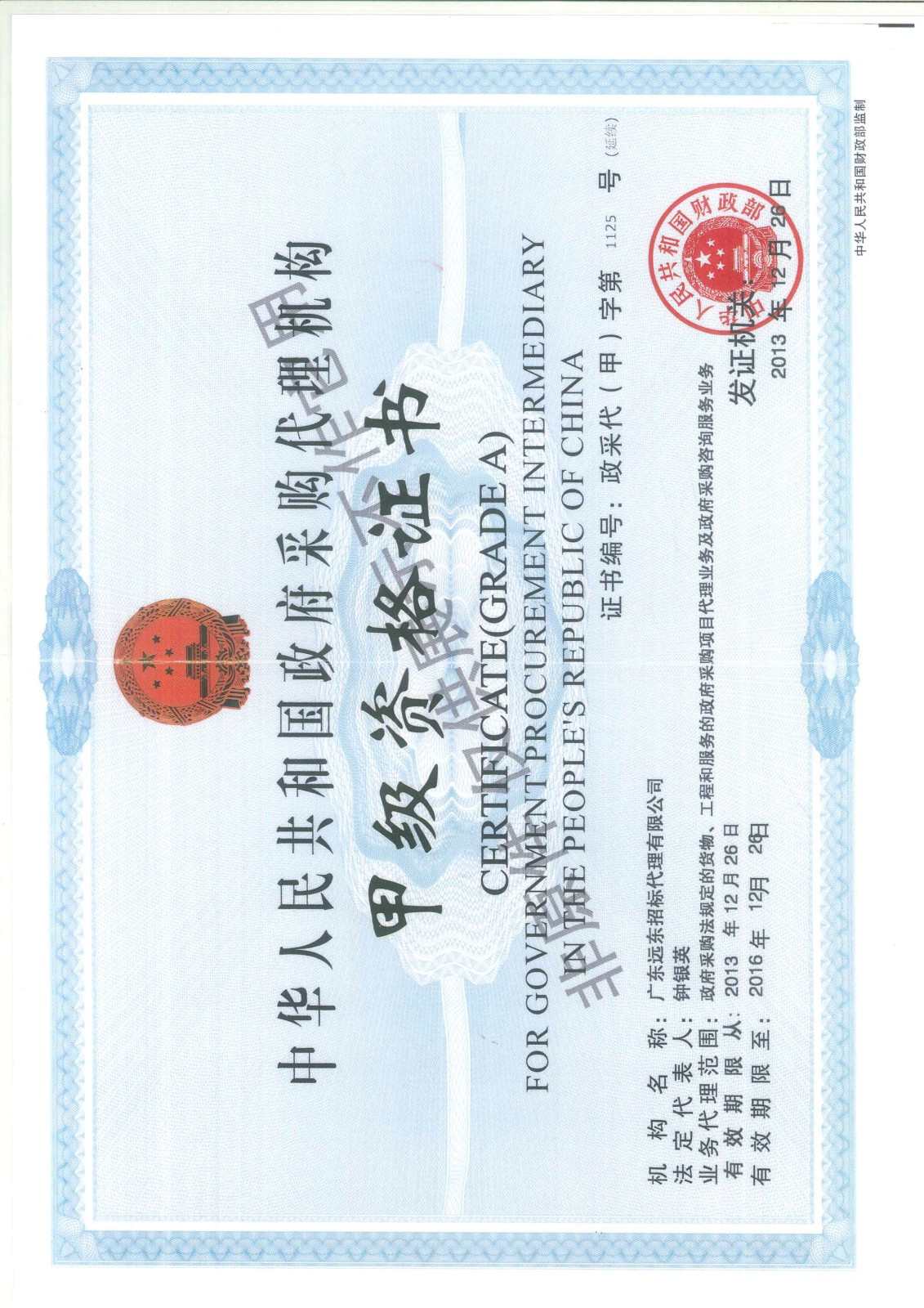 政府采購(gòu)代理甲級(jí)資質(zhì)